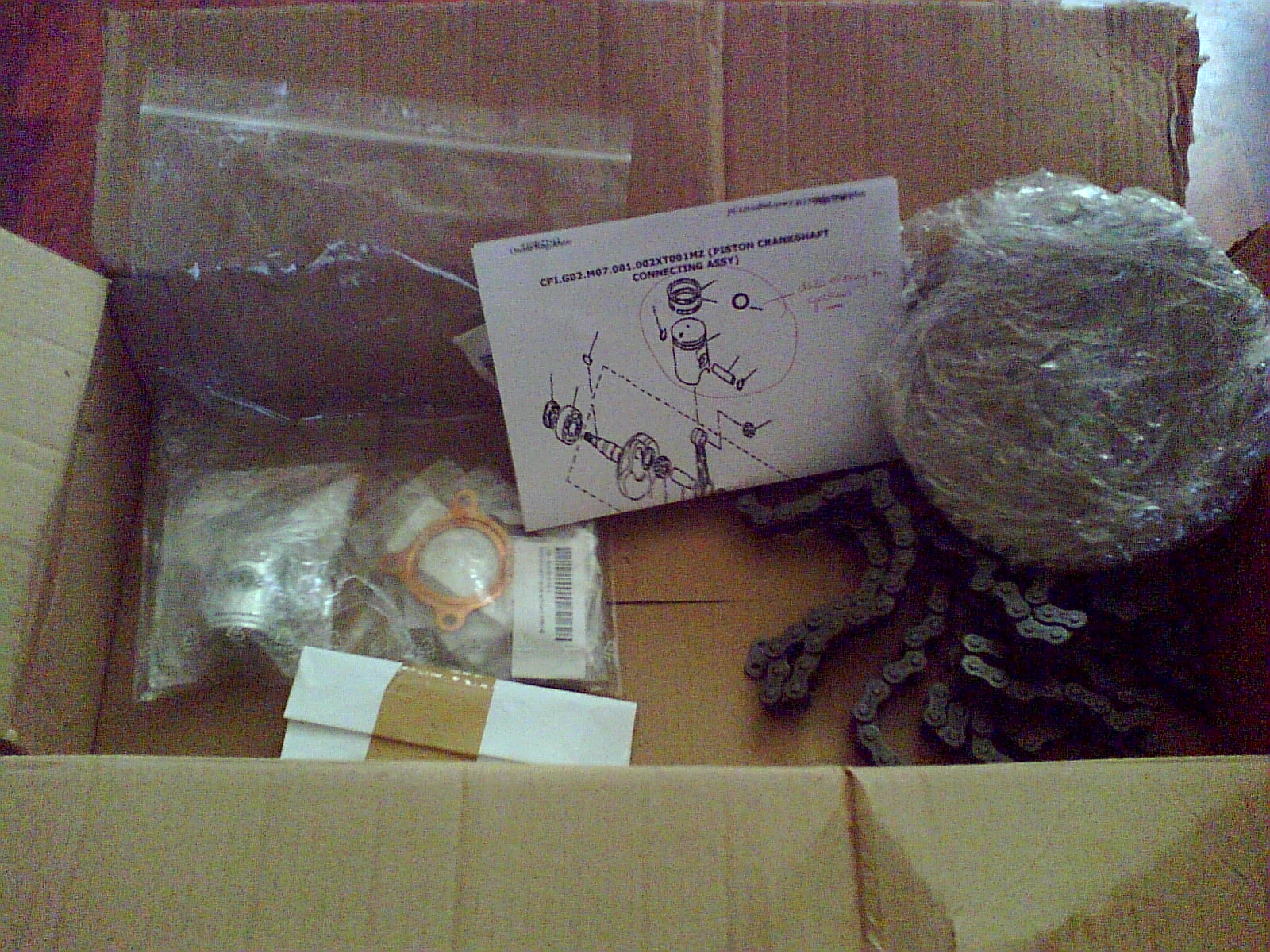 in de doos bevind zich het zuigersetje met pakkingen alles er op en er aan daarnaast bevind zich het tandwiel van 43 tands en natuurlijk de ketting