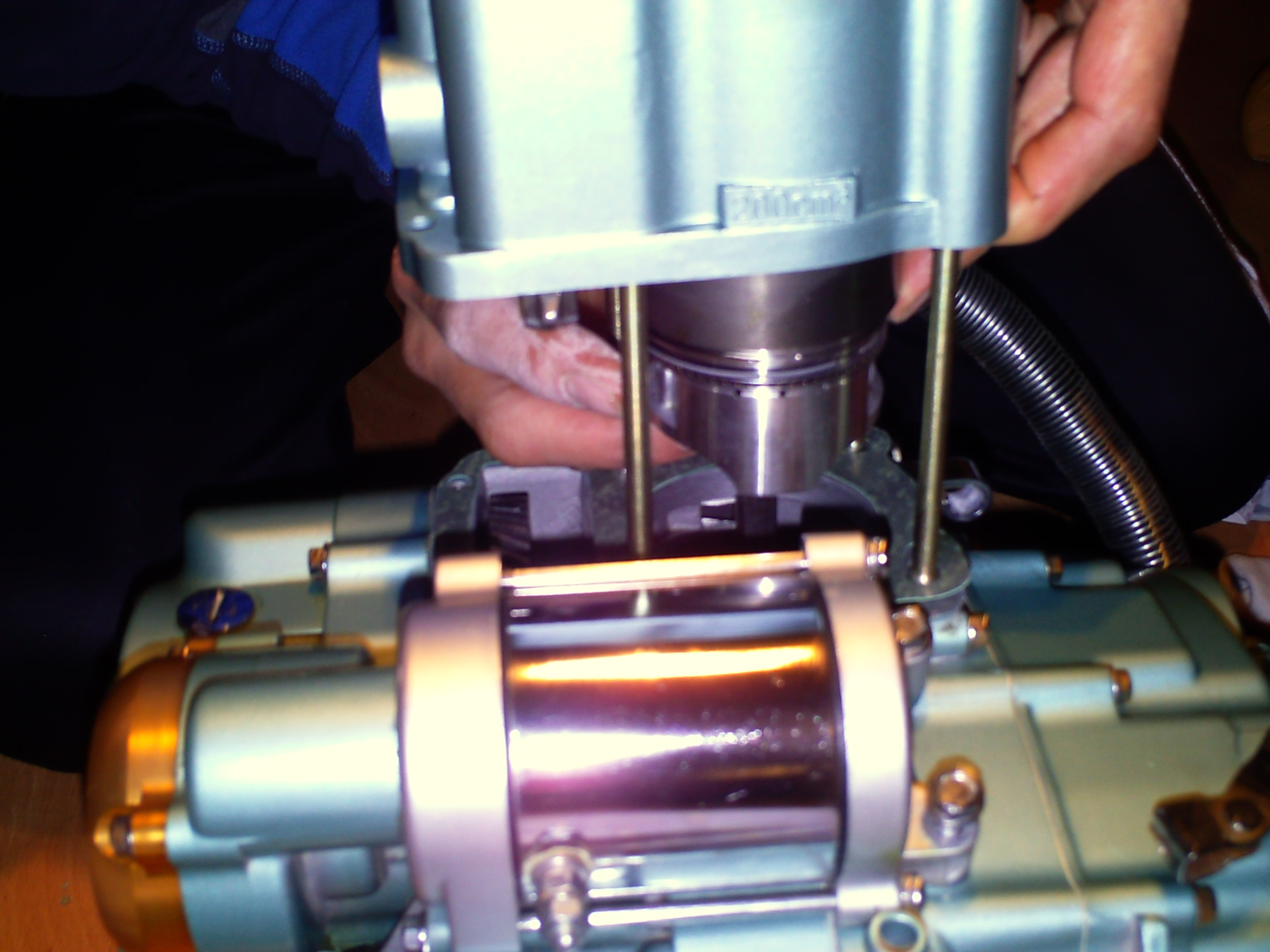 ontvet de pakkingen goed voor het plaatsen en zet dan de cilinder zachtje op de zuiger duw de veren zachtje in de zuiger en laat de cilinder er zachtje overheen zakken .ps de zuigerveren hebben geen borgpin dit is niet nodig omdat er geen spoelpoorten in de cilinder zitten
