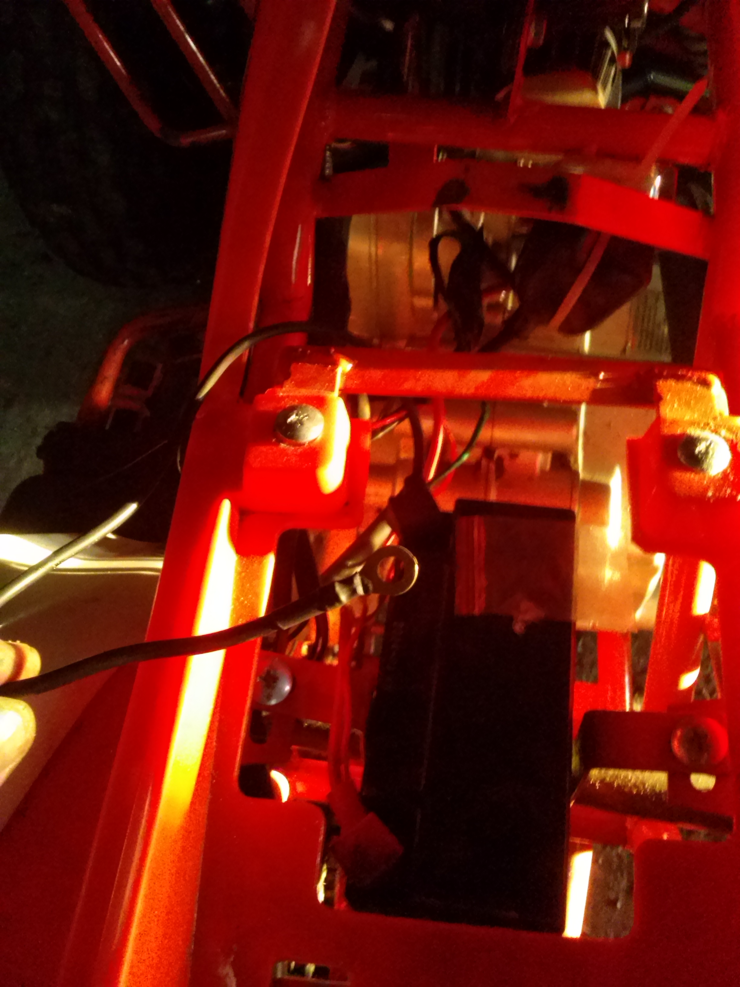 De zwarte draad en de groene draad komen van de - pool, de groene draad is gesmolten tot aan de kabelboom en de zwarte moet ik dus als aarde draad bevestigen op het frame.