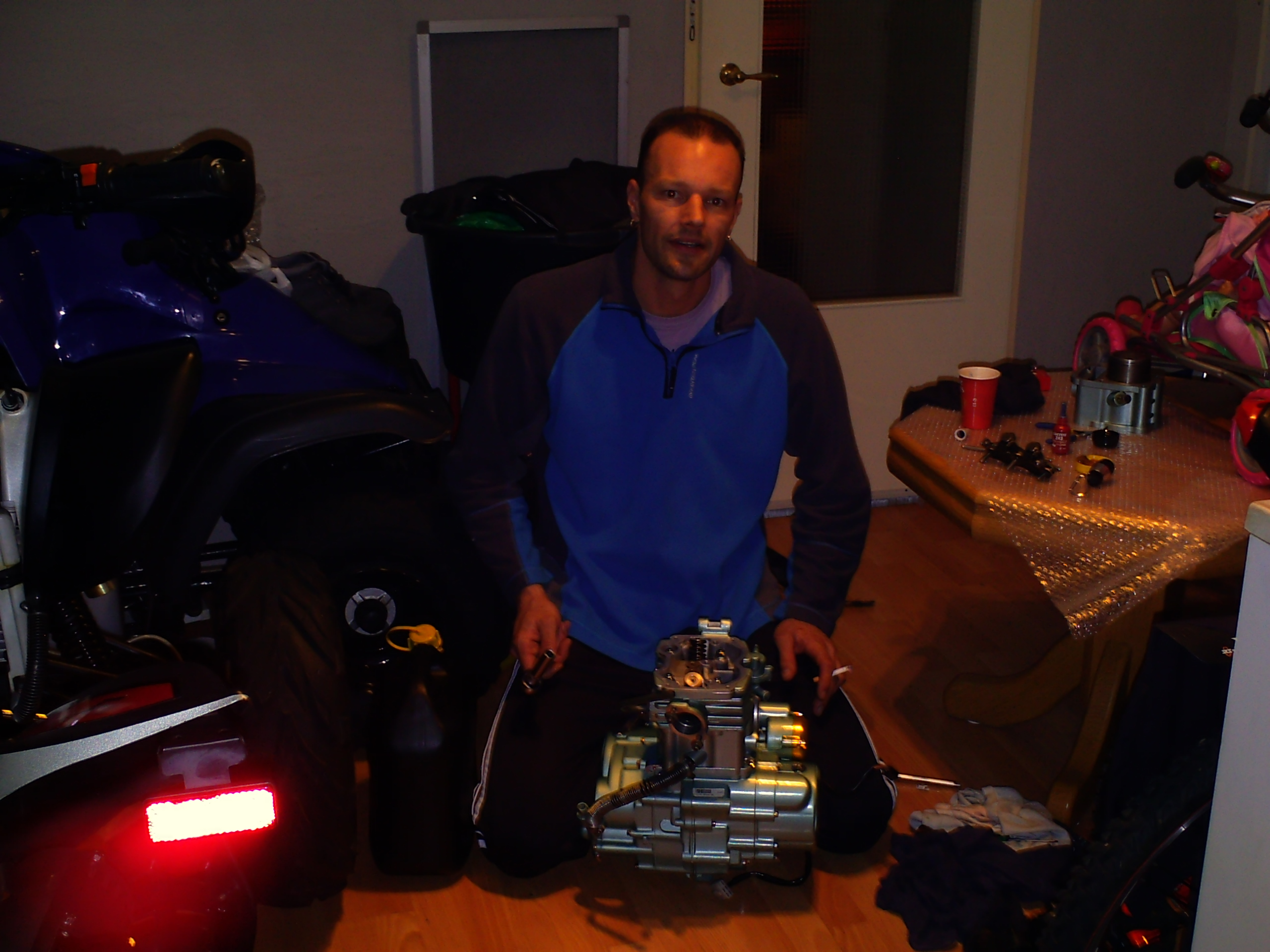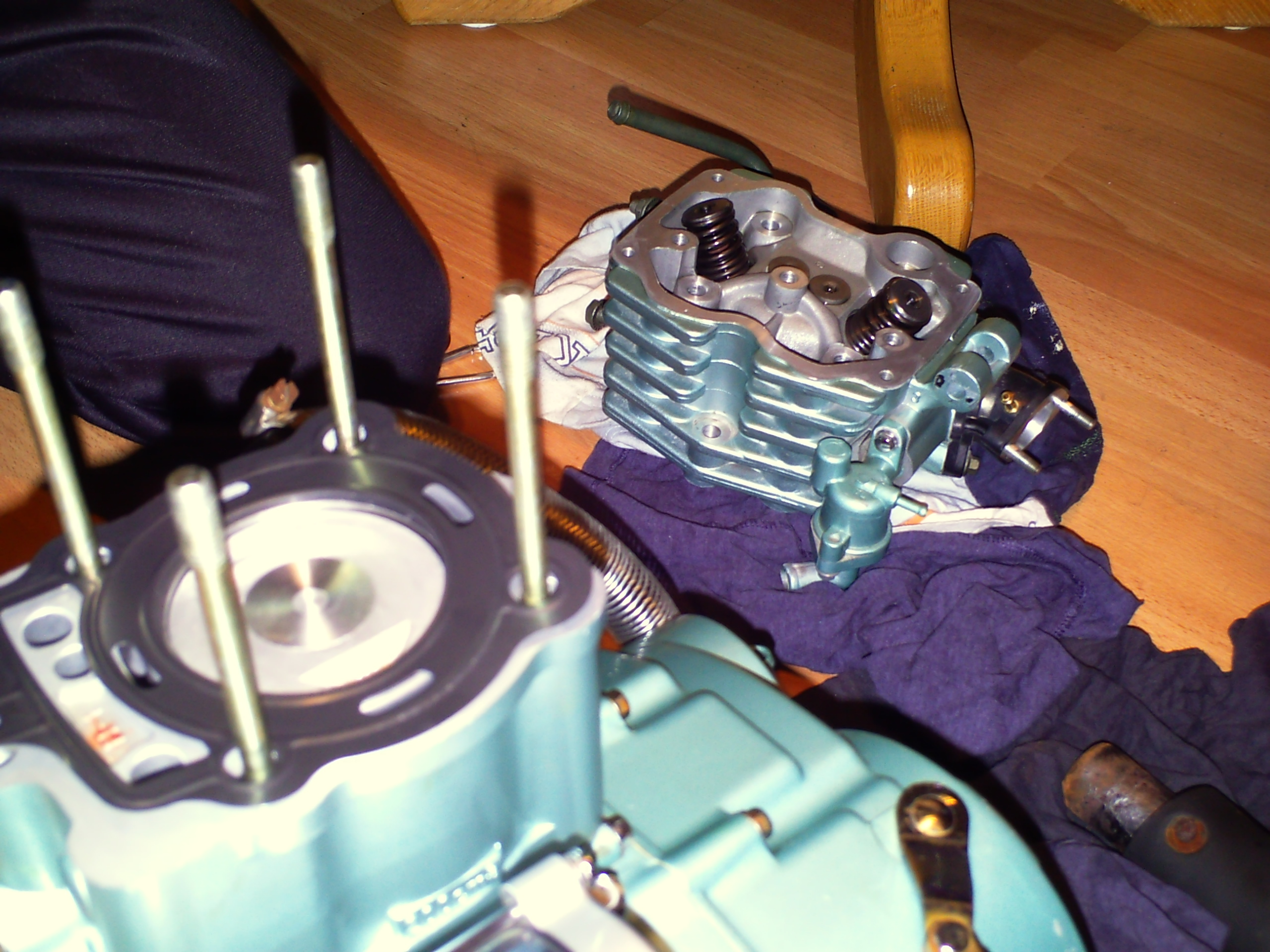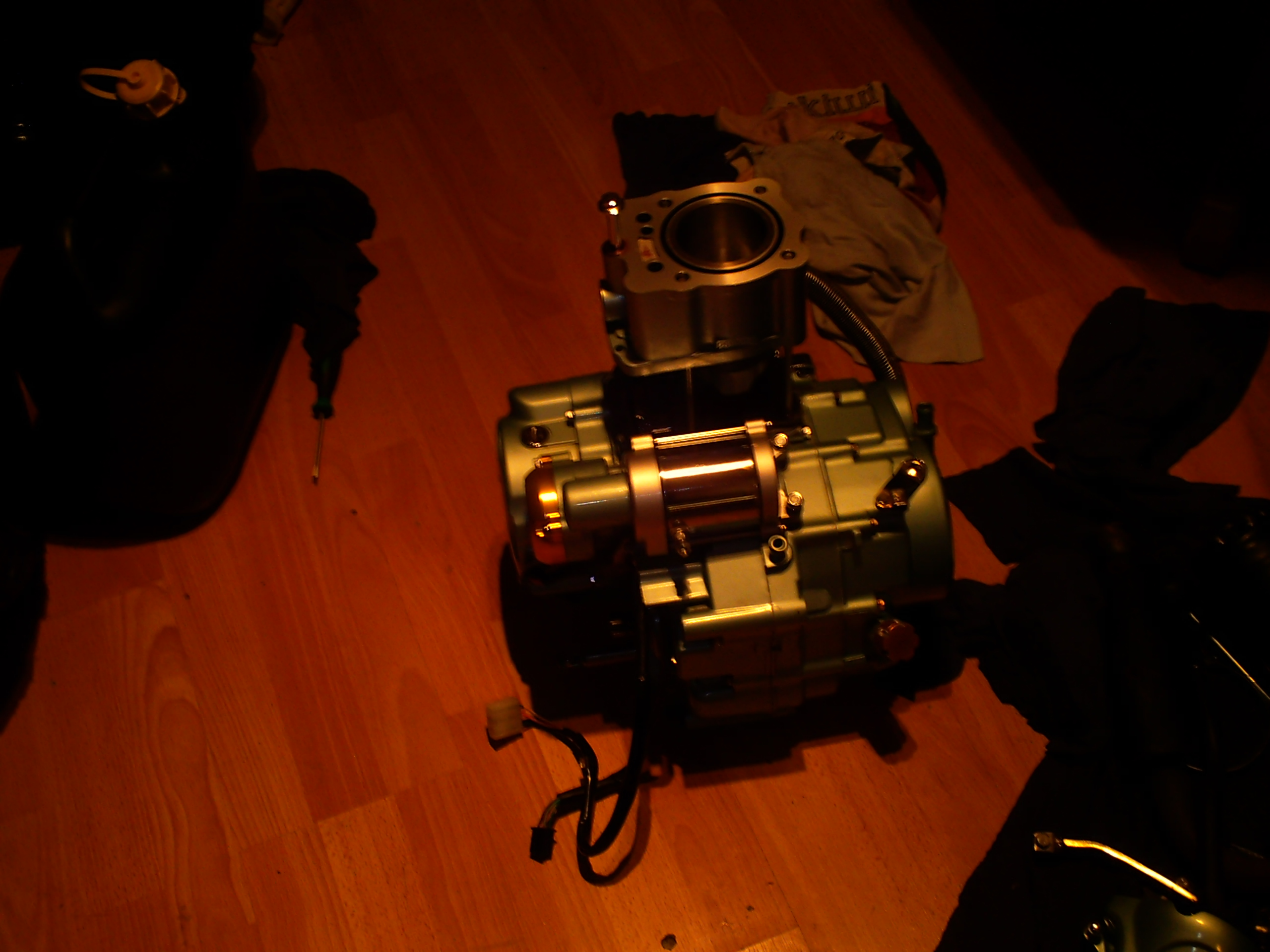 als het blok er weer onder hangt 0.8 liter olie bijvullen en koelwater via radiateur vullen ook het expantie vaatje vullen tot de bovenste streep dan eerst even starten zonder bougie dop kan de olie een beetje rond in de motor.<br />en dan de eerste start bougie dop er dus op en als de motor loopt koelvloeistof afvullen met draaiende motor doe dit wel voordat hij echt warm is.